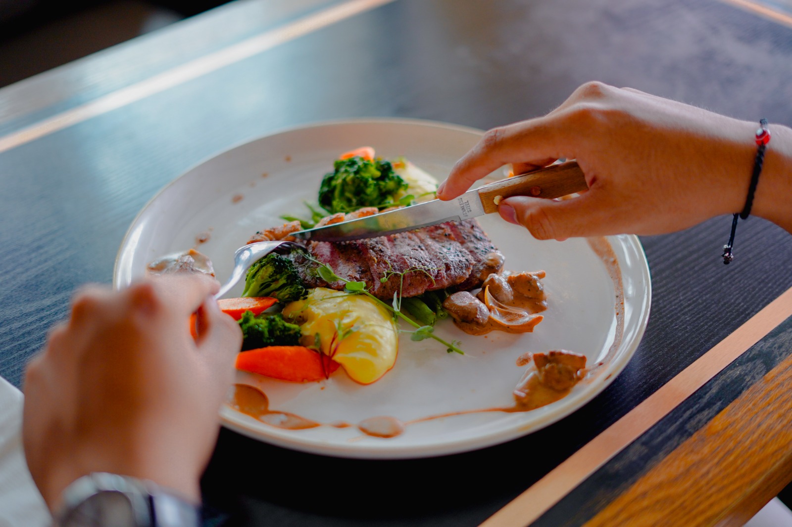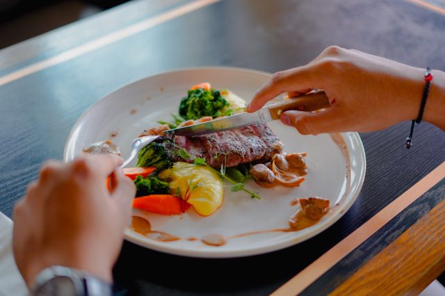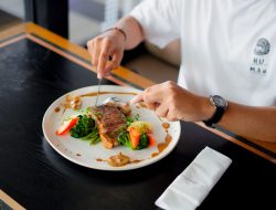 French Steak au Poivre (IDR 231,000++): striploin panggang dengan saus lada hitam, sayuran segar, dan kentang tumbuk lembut. Menu ini merepresentasikan keanggunan rasa steak ala Prancis.